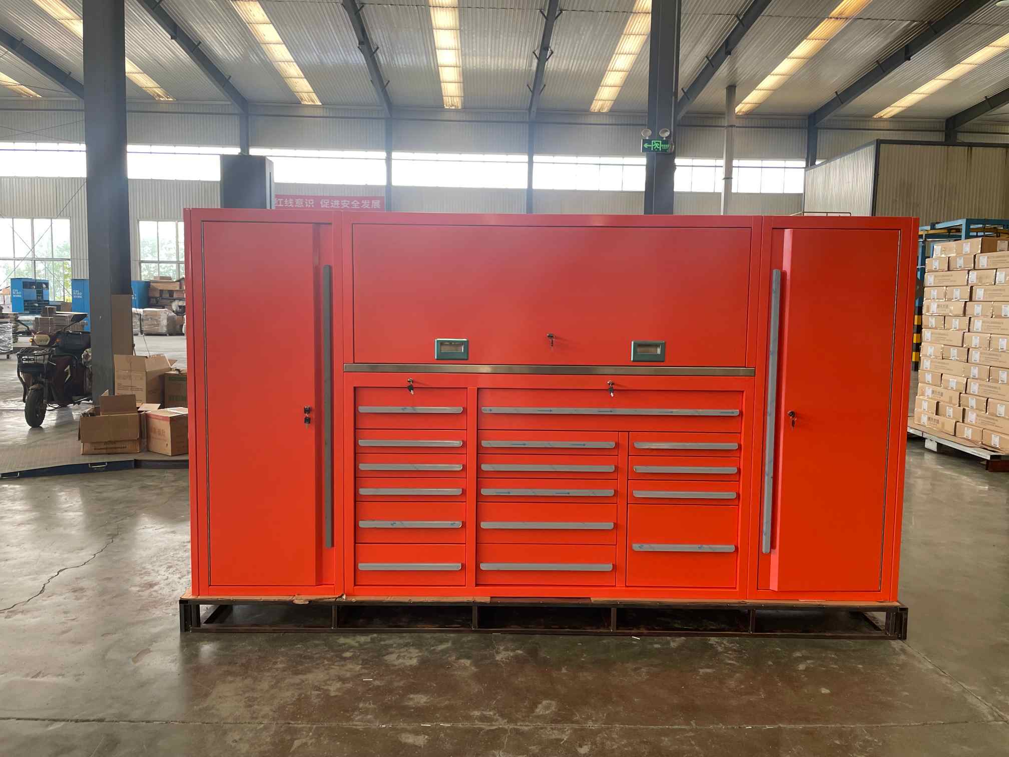 De Cyjy Cold Rolled stalen gereedschapskast is een zware gereedschapskast met meerdere laden. Het heeft een professioneel uiterlijk, een glad oppervlak en is uitgerust met zware wielen en veiligheidsloten. Het wordt in de workshopomgeving geplaatst.